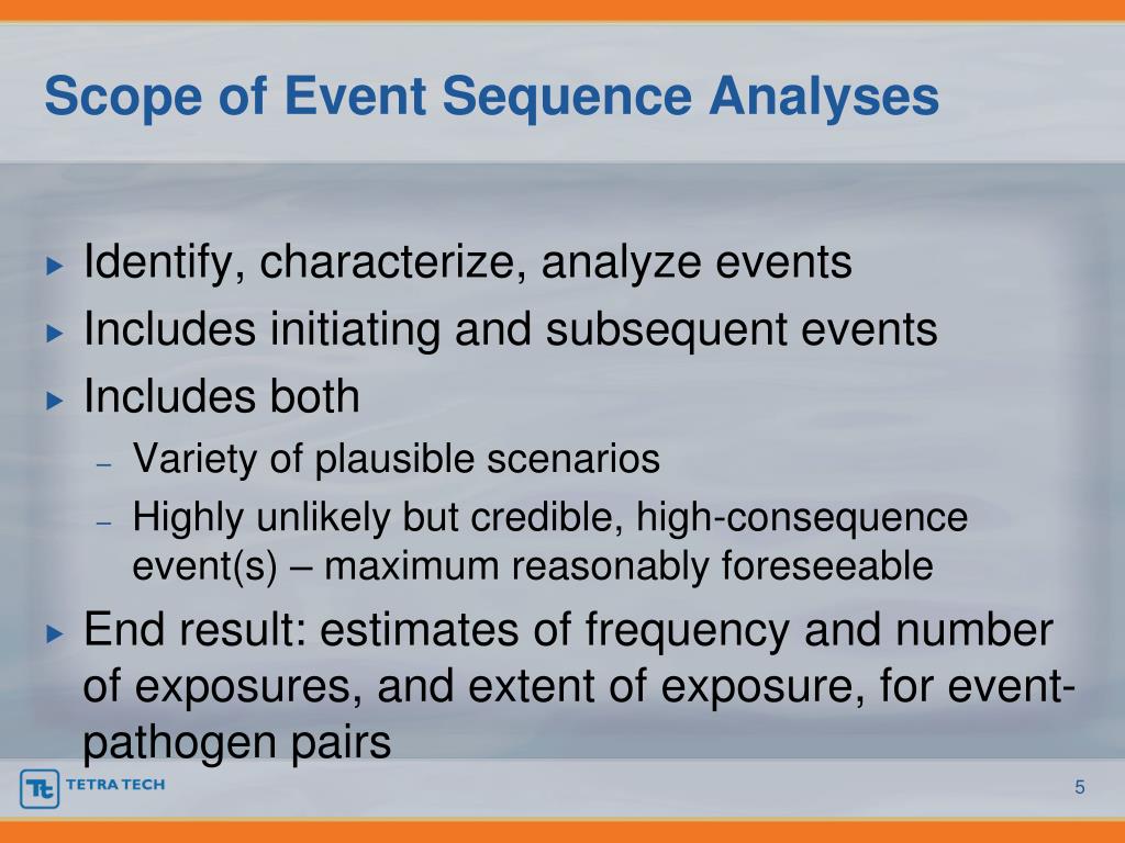 Scope of Event Sequence Analyses • Identify, characterize, analyze events • Includes initiating and subsequent events • Includes both • Variety of plausible scenarios • Highly unlikely but credible, high-consequence event(s) – maximum reasonably foreseeable • End result: estimates of frequency and number of exposures, and extent of exposure, for event-pathogen pairs
