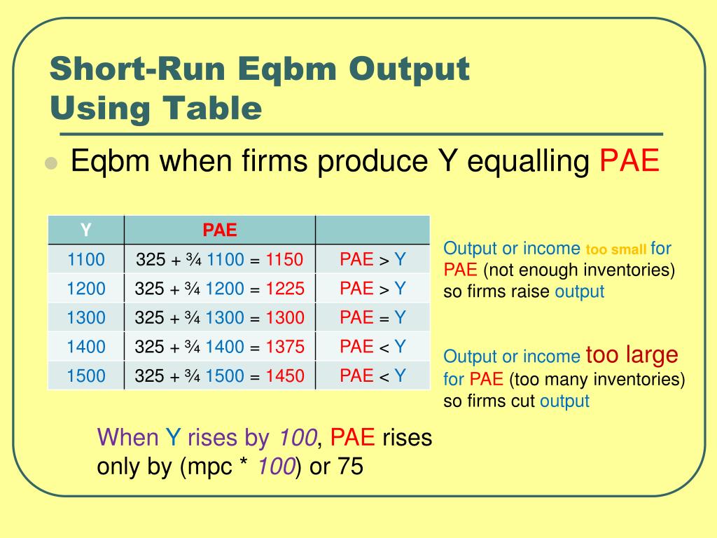 Short-Run Eqbm OutputUsing Table • Eqbm when firms produce Y equalling PAE Output or income too small for PAE (not enough inventories) so firms raise output Output or income too large for PAE (too many inventories) so firms cut output When Y rises by 100, PAE rises only by (mpc * 100) or 75