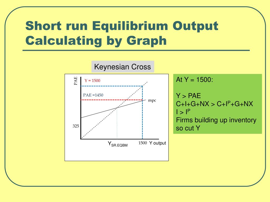PAE Y = 1500 Short run Equilibrium OutputCalculating by Graph PAE =1450 mpc 325 Keynesian Cross 1500 At Y = 1500: Y > PAE C+I+G+NX > C+IP+G+NX I > IP Firms building up inventory so cut Y YSR.EQBM Y output