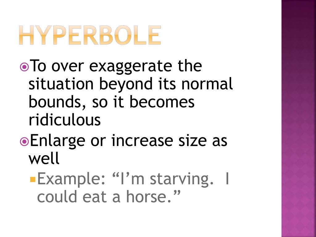 Hyperbole • To over exaggerate the situation beyond its normal bounds, so it becomes ridiculous • Enlarge or increase size as well • Example: “I’m starving. I could eat a horse.”