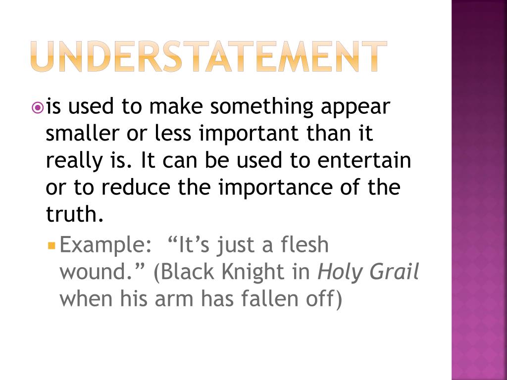 Understatement • is used to make something appear smaller or less important than it really is. It can be used to entertain or to reduce the importance of the truth. • Example: “It’s just a flesh wound.” (Black Knight in Holy Grail when his arm has fallen off)