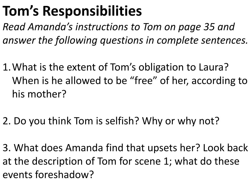 Tom’s Responsibilities Read Amanda’s instructions to Tom on page 35 and answer the following questions in complete sentences. What is the extent of Tom’s obligation to Laura? When is he allowed to be “free” of her, according to his mother? 2. Do you think Tom is selfish? Why or why not? 3. What does Amanda find that upsets her? Look back at the description of Tom for scene 1; what do these events foreshadow?
