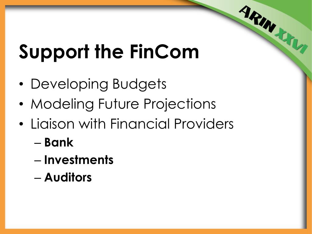 Support the FinCom • Developing Budgets • Modeling Future Projections • Liaison with Financial Providers • Bank • Investments • Auditors