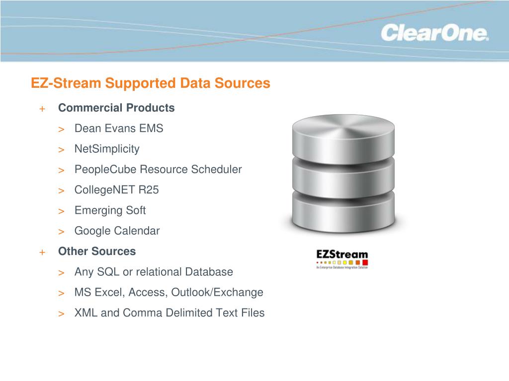 EZ-Stream Supported Data Sources Commercial Products Dean Evans EMS NetSimplicity PeopleCube Resource Scheduler CollegeNET R25 Emerging Soft Google Calendar Other Sources Any SQL or relational Database MS Excel, Access, Outlook/Exchange XML and Comma Delimited Text Files