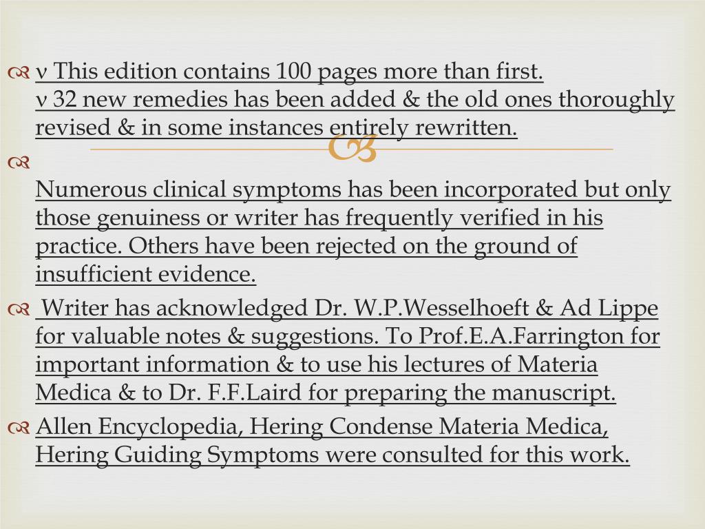 This edition contains 100 pages more than first. 32 new remedies has been added & the old ones thoroughly revised & in some instances entirely rewritten. • Numerous clinical symptoms has been incorporated but only those genuiness or writer has frequently verified in his practice. Others have been rejected on the ground of insufficient evidence. • Writer has acknowledged Dr. W.P.Wesselhoeft & Ad Lippe for valuable notes & suggestions. To Prof.E.A.Farrington for important information & to use his lectures of MateriaMedica & to Dr. F.F.Laird for preparing the manuscript. • Allen Encyclopedia, Hering Condense MateriaMedica, Hering Guiding Symptoms were consulted for this work.