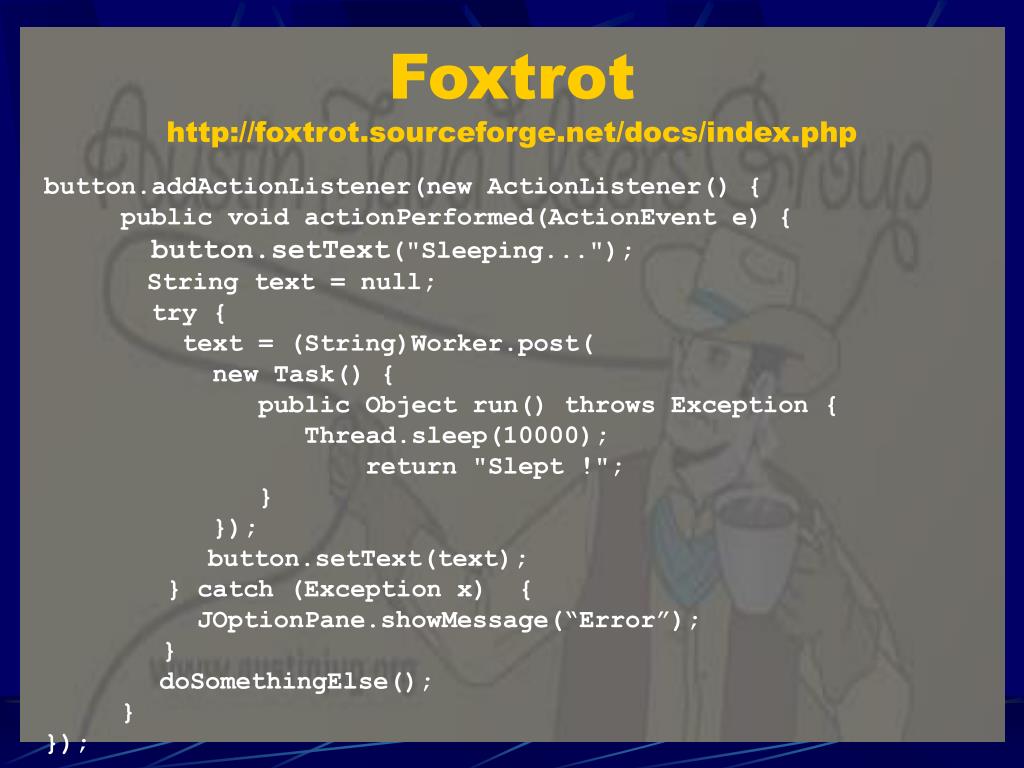Foxtrothttp://foxtrot.sourceforge.net/docs/index.php button.addActionListener(new ActionListener() { public void actionPerformed(ActionEvent e) { button.setText("Sleeping..."); String text = null; try { text = (String)Worker.post( new Task() { public Object run() throws Exception { Thread.sleep(10000); return "Slept !"; } }); button.setText(text); } catch (Exception x) { JOptionPane.showMessage(“Error”); } doSomethingElse(); } });