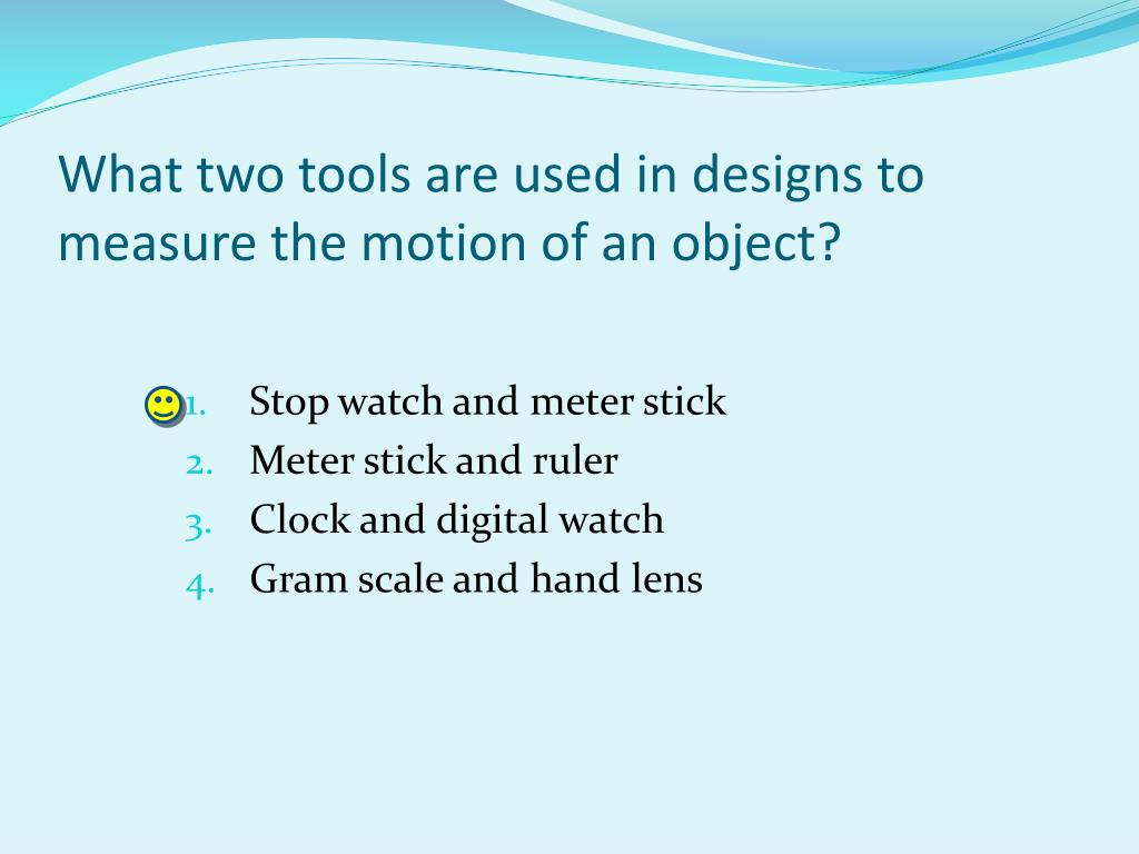What two tools are used in designs to measure the motion of an object? • Stop watch and meter stick • Meter stick and ruler • Clock and digital watch • Gram scale and hand lens