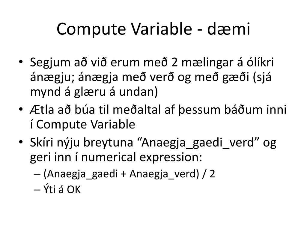 Compute Variable - dæmi • Segjum að við erum með 2 mælingar á ólíkri ánægju; ánægja með verð og með gæði (sjá mynd á glæru á undan) • Ætla að búa til meðaltal af þessum báðum inni í Compute Variable • Skíri nýju breytuna “Anaegja_gaedi_verd” og geri inn í numerical expression: • (Anaegja_gaedi + Anaegja_verd) / 2 • Ýti á OK