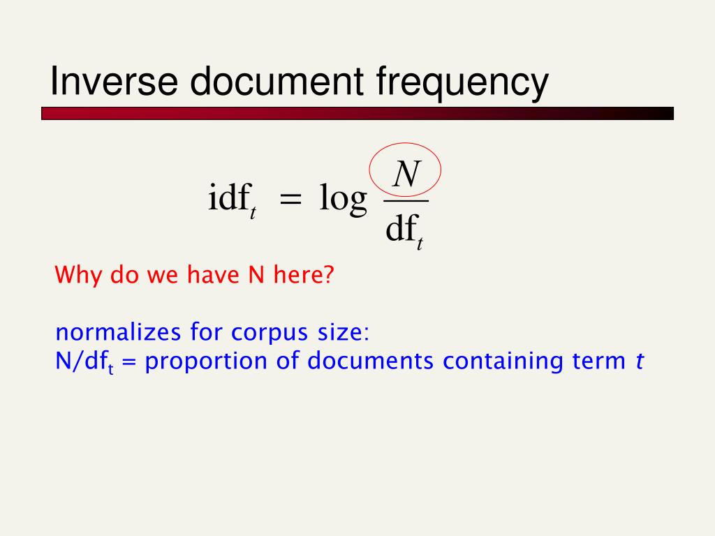 Inverse document frequency Why do we have N here? normalizes for corpus size: N/dft = proportion of documents containing term t