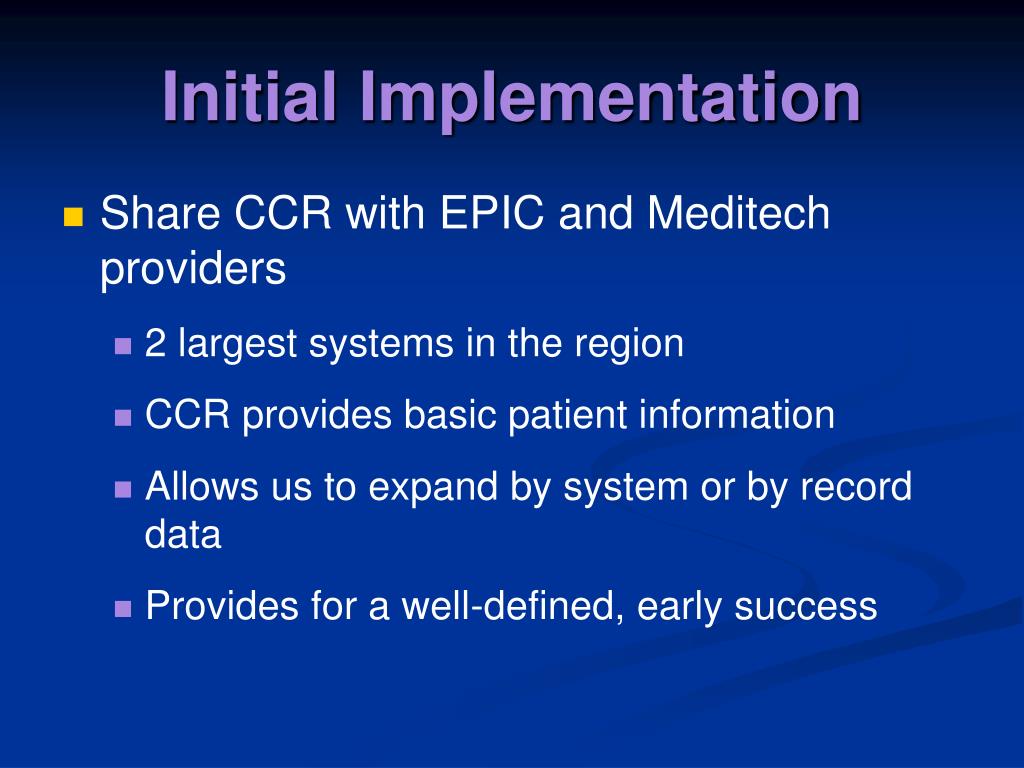 Initial Implementation • Share CCR with EPIC and Meditech providers • 2 largest systems in the region • CCR provides basic patient information • Allows us to expand by system or by record data • Provides for a well-defined, early success
