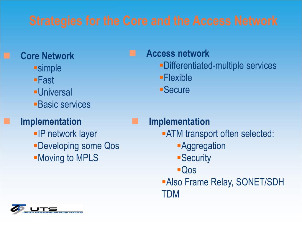 Strategies for the Core and the Access Network • n Access network • Differentiated-multiple services • Flexible • Secure • n Core Network • simple • Fast • Universal • Basic services • n Implementation • ATM transport often selected: • Aggregation • Security • Qos • Also Frame Relay, SONET/SDH TDM n Implementation IP network layer Developing some Qos Moving to MPLS