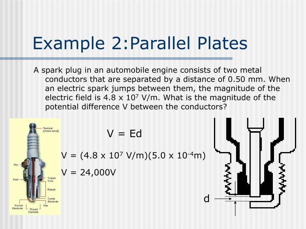 d Example 2:Parallel Plates A spark plug in an automobile engine consists of two metal conductors that are separated by a distance of 0.50 mm. When an electric spark jumps between them, the magnitude of the electric field is 4.8 x 107 V/m. What is the magnitude of the potential difference V between the conductors? V = Ed V = (4.8 x 107 V/m)(5.0 x 10-4m) V = 24,000V