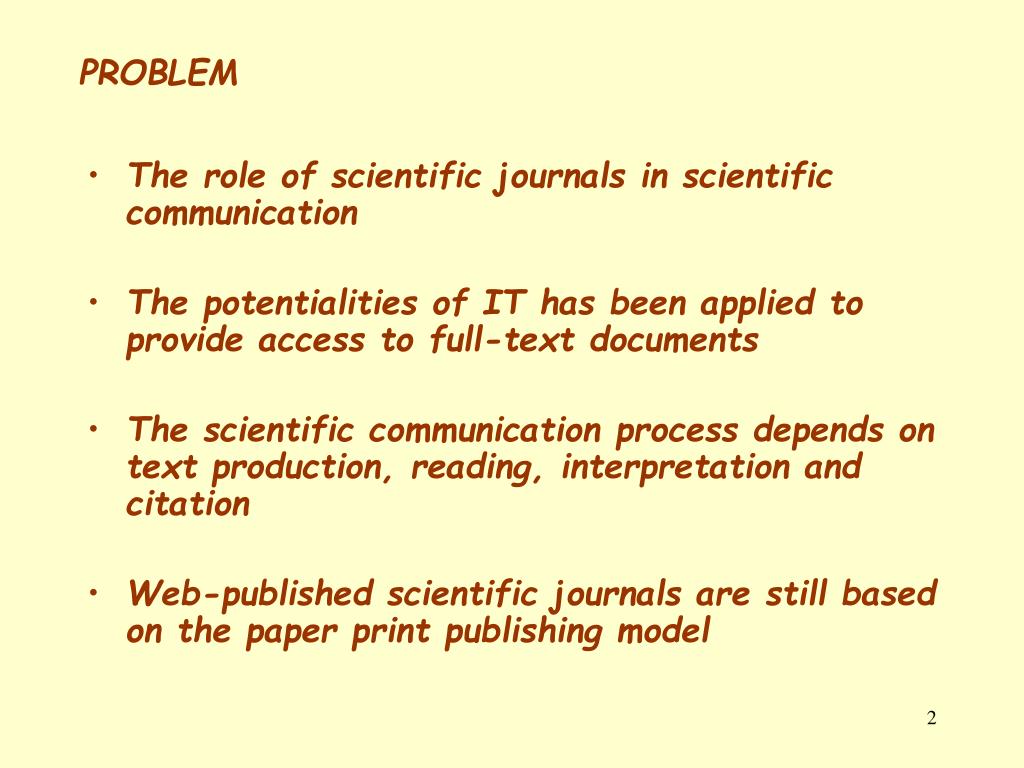 PROBLEM • The role of scientific journals in scientific communication • The potentialities of IT has been applied to provide access to full-text documents • The scientific communication process depends on text production, reading, interpretation and citation • Web-published scientific journals are still based on the paper print publishing model