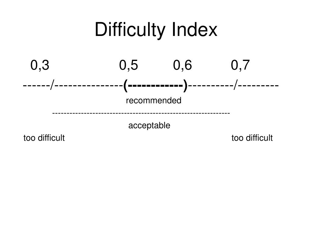 Difficulty Index 0,3 0,5 0,6 0,7 ------/---------------(------------)----------/--------- recommended -------------------------------------------------------------- acceptable too difficult too difficult