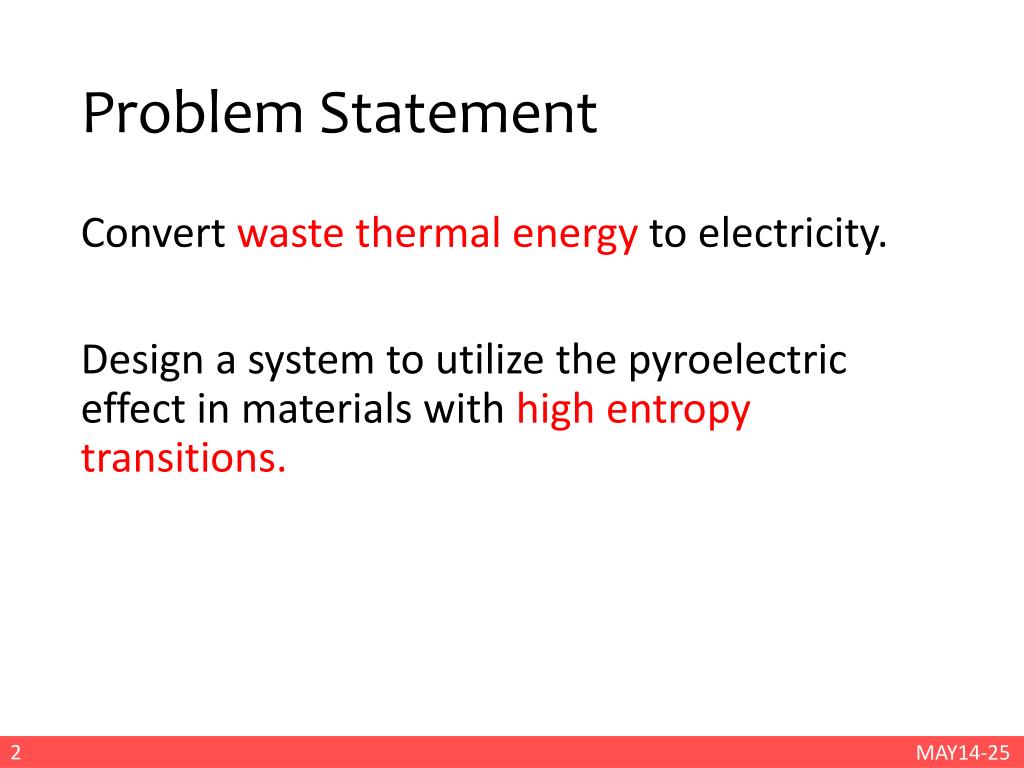 Problem Statement Convert waste thermal energy to electricity. Design a system to utilize the pyroelectric effect in materials with high entropy transitions. MAY14-25