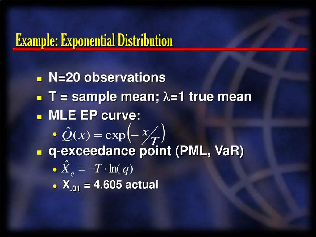 Example: Exponential Distribution • N=20 observations • T = sample mean; l=1 true mean • MLE EP curve: • q-exceedance point (PML, VaR) • X.01 = 4.605 actual