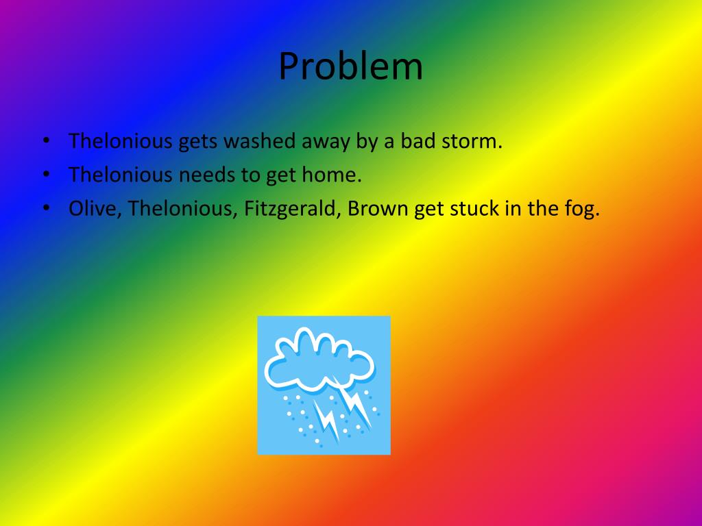 Problem • Thelonious gets washed away by a bad storm. • Thelonious needs to get home. • Olive, Thelonious, Fitzgerald, Brown get stuck in the fog.