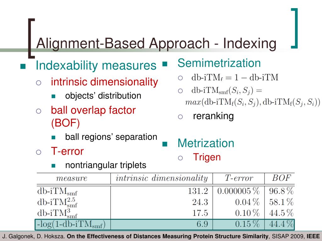 Alignment-Based Approach - Indexing • Indexability measures • intrinsic dimensionality • objects’ distribution • ball overlap factor (BOF) • ball regions’ separation • T-error • nontriangular triplets • Semimetrization • reranking • Metrization • Trigen J. Galgonek, D. Hoksza. On the Effectiveness of Distances Measuring Protein Structure Similarity, SISAP 2009, IEEE