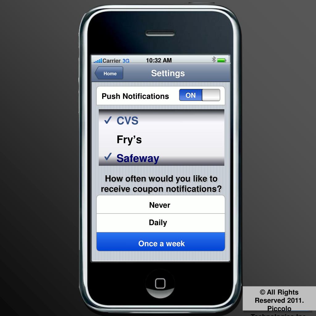 ON 10:32 AM Carrier ON Settings Options App Home Screen This is where your app starts. Feel free to delete the instructions on the iPhone screen and start pasting UI elements from the MockApp library file. Have fun using MockApp! Home CVS Fry’s Safeway Push Notifications How often would you like to receive coupon notifications? Never Daily Once a week • © All Rights Reserved 2011. Piccolo Technologies Inc.