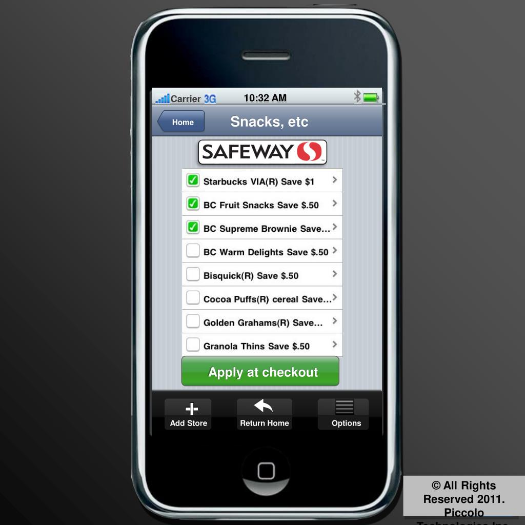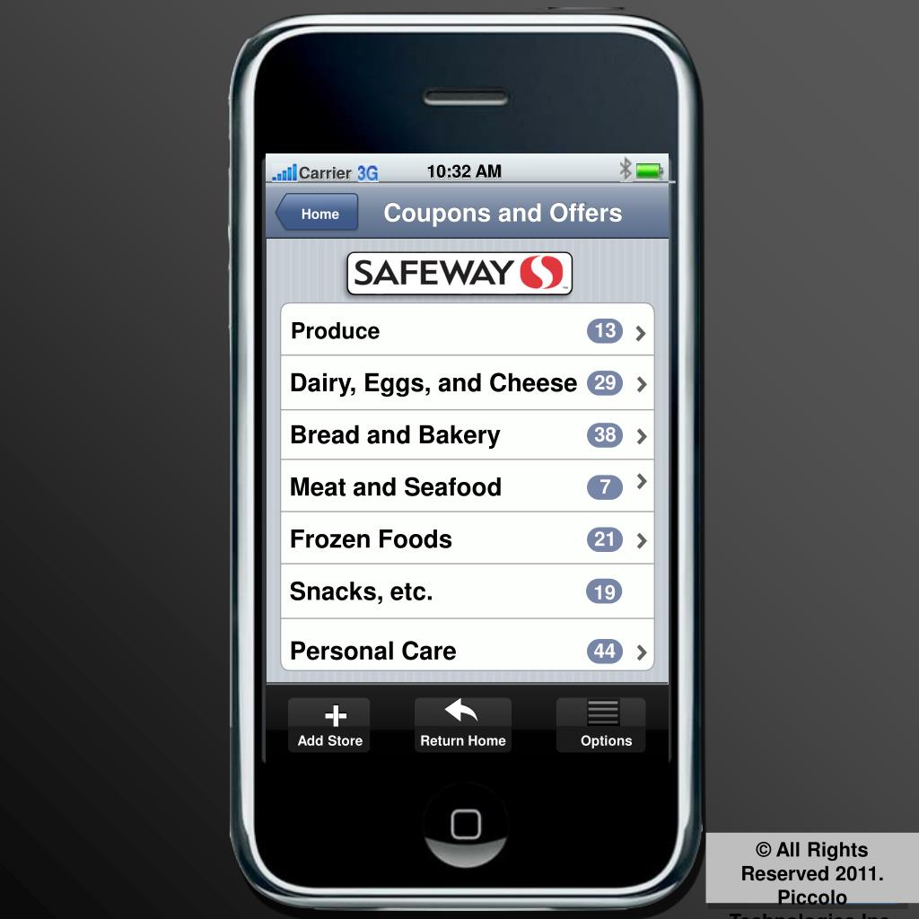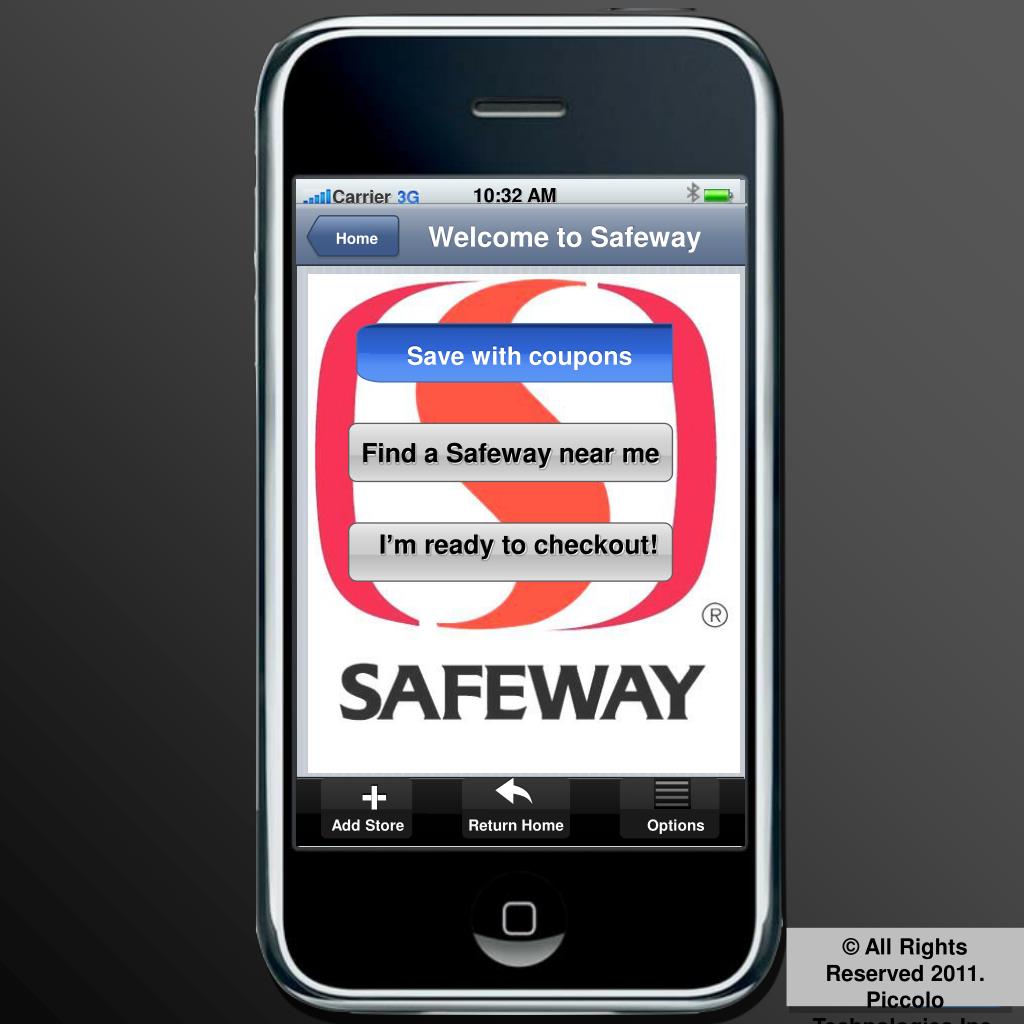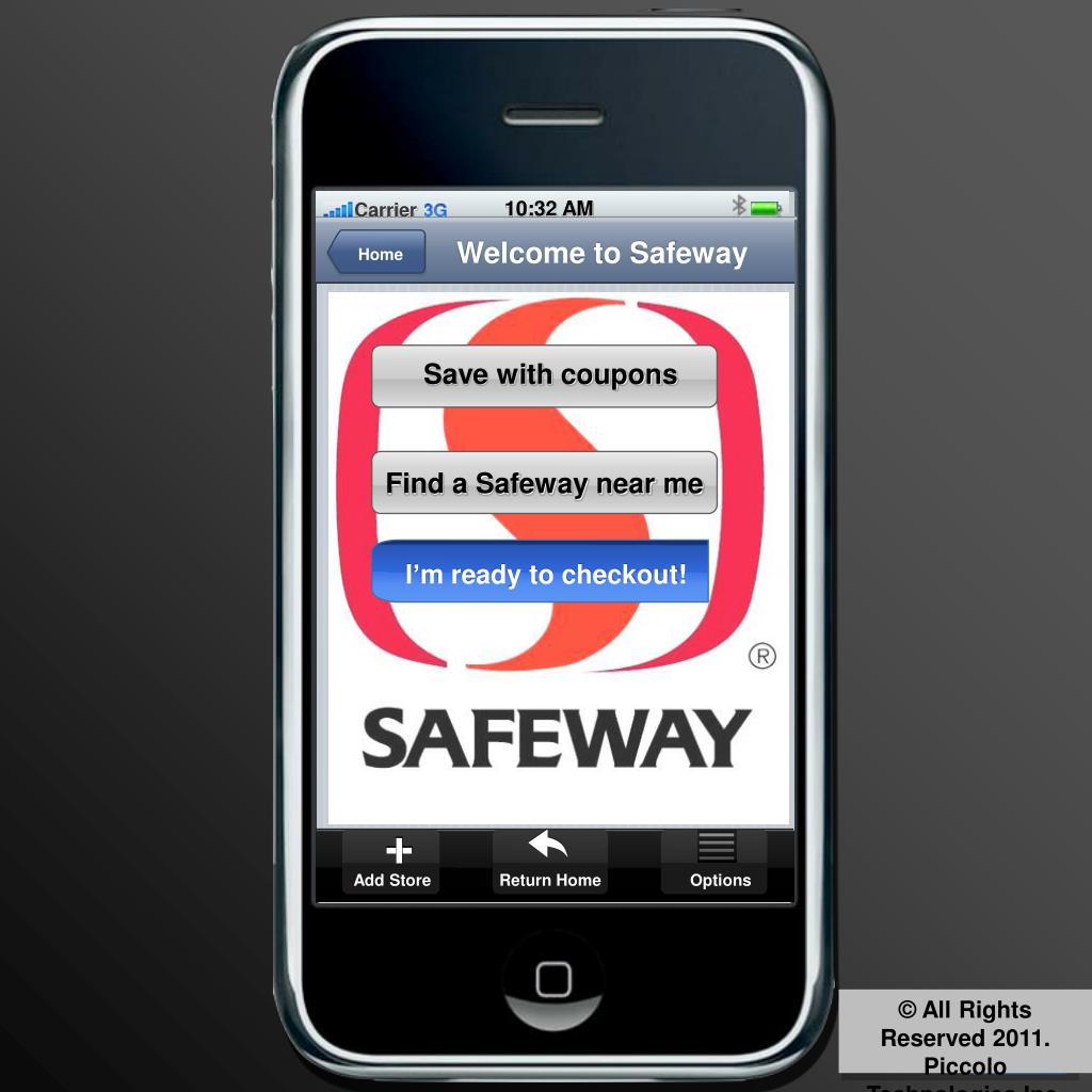 10:32 AM Carrier Welcome to Safeway Save with coupons App Home Screen This is where your app starts. Feel free to delete the instructions on the iPhone screen and start pasting UI elements from the MockApp library file. Have fun using MockApp! Home Save with coupons Find a Safeway near me I’m ready to checkout! Add Store Return Home Options • © All Rights Reserved 2011. Piccolo Technologies Inc.