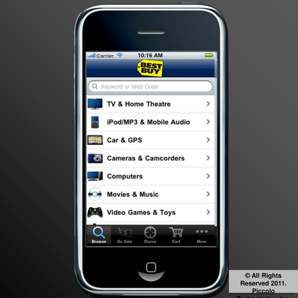Launch screen (static) iPhone OS displays this full-screen image instantly when the user taps your application icon on the Home screen as a placeholder for your app until it starts. Apple recommends designing a launch screen that creates the illusion that your app has already started (even though it’s just an image). One great way to do that is to have a launch screen that looks just like the background of your app’s first screen (but without the data populated of course). • © All Rights Reserved 2011. Piccolo Technologies Inc.