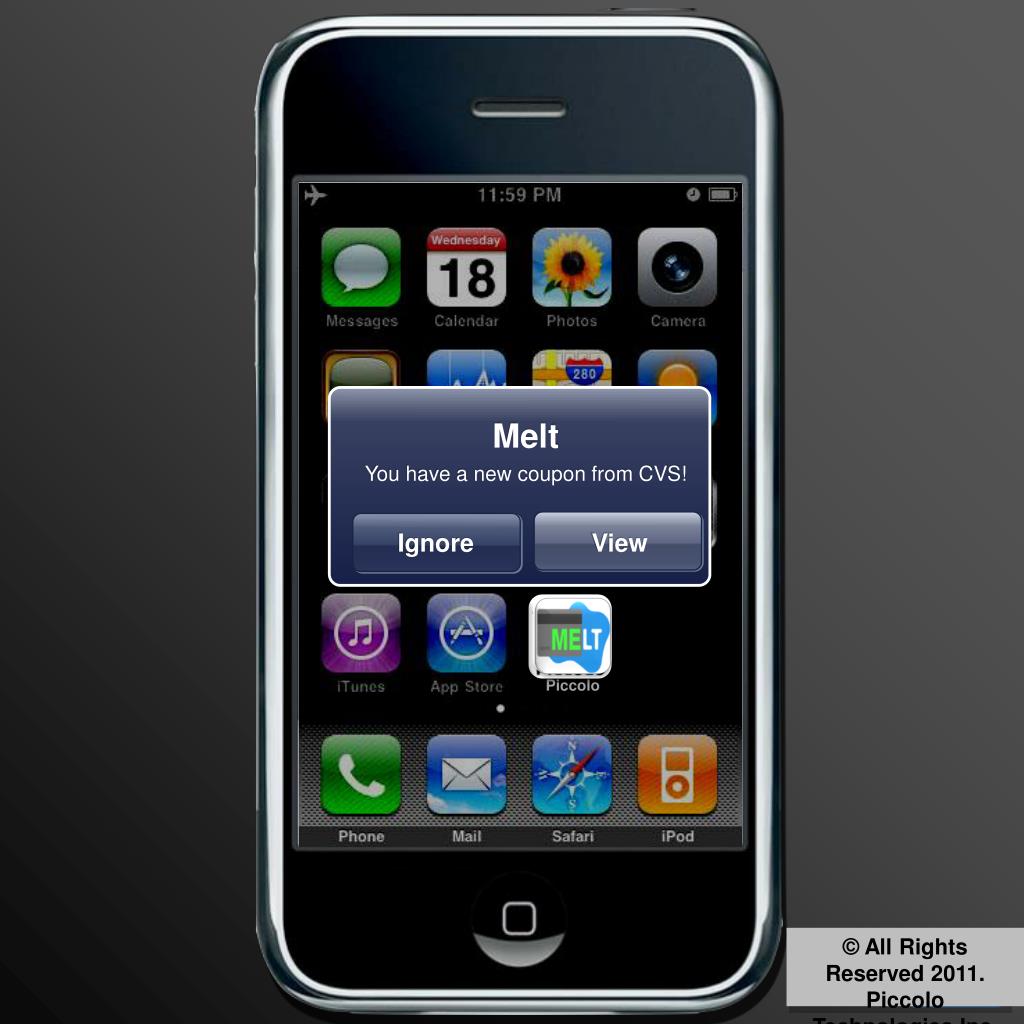 Melt You have a new coupon from CVS! Ignore View Home Screen This is a default iPhone home screen to start your demos from. In presentation mode, the red icon acts as a button that links to the 2nd slide, where your mockup loading screen should display. You can replace the red button by your own 57x57 icon. Just don’t forget to hyperlink it to slide 2. If you own photoshop this tutorial might be handy: http://www.photoguides.net/photoshopping-iphone-icons Your 57x57 icon here Your 57x57 icon here Piccolo • © All Rights Reserved 2011. Piccolo Technologies Inc.