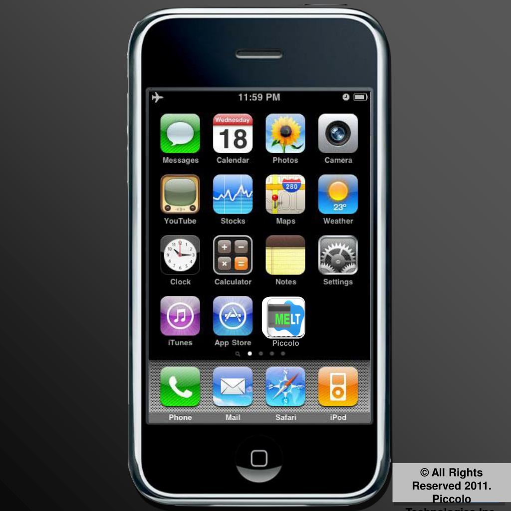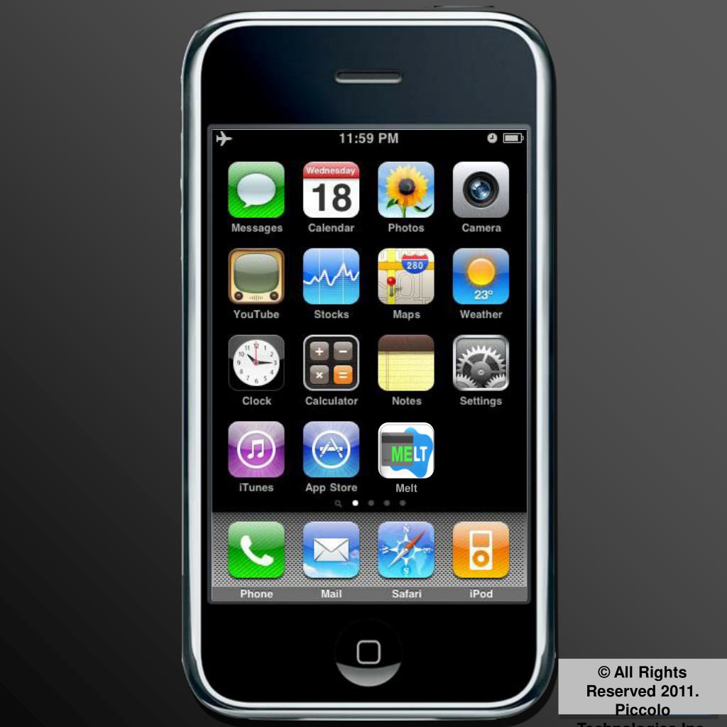 Home Screen This is a default iPhone home screen to start your demos from. In presentation mode, the red icon acts as a button that links to the 2nd slide, where your mockup loading screen should display. You can replace the red button by your own 57x57 icon. Just don’t forget to hyperlink it to slide 2. If you own photoshop this tutorial might be handy: http://www.photoguides.net/photoshopping-iphone-icons Your 57x57 icon here Melt • © All Rights Reserved 2011. Piccolo Technologies Inc.