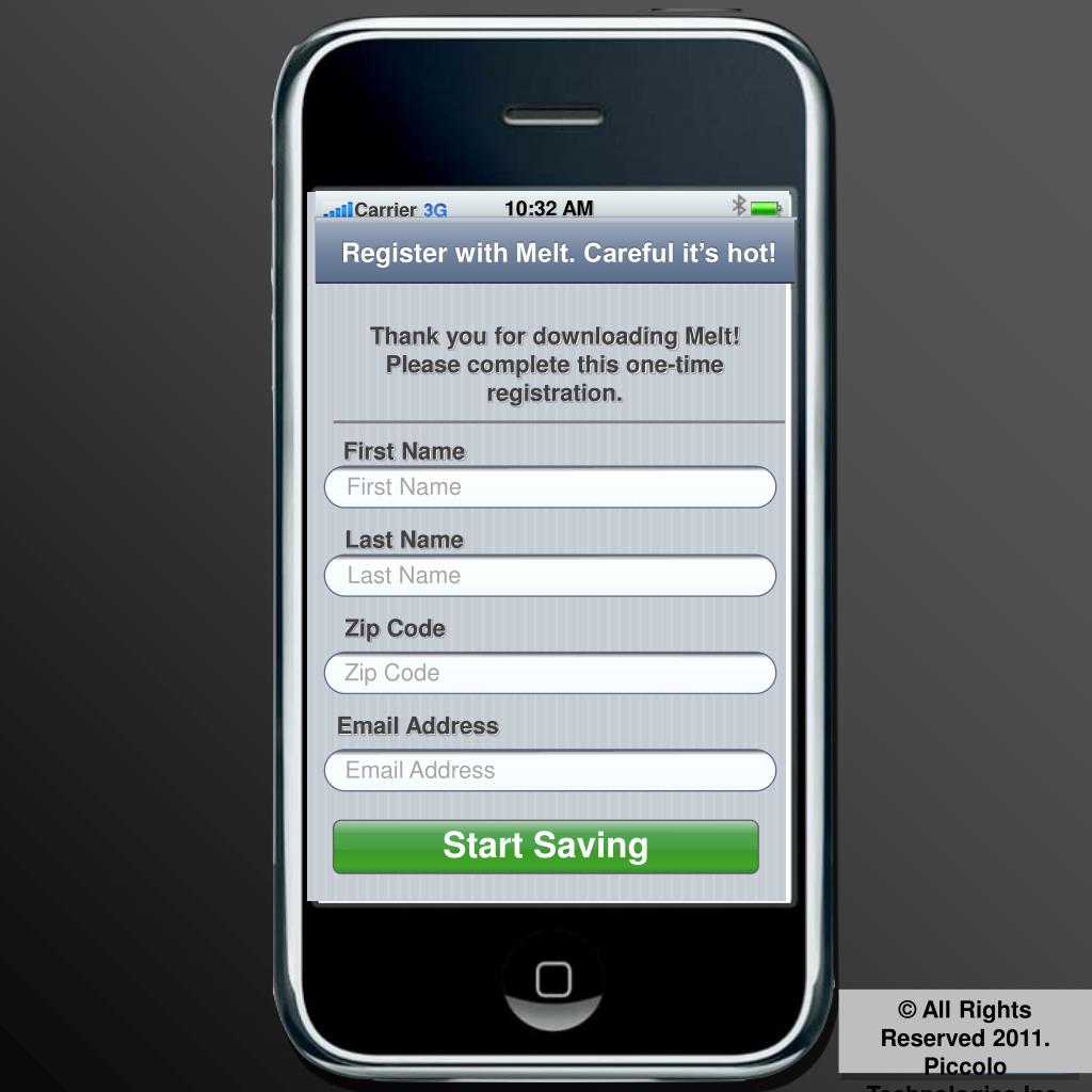 10:32 AM Carrier Register with Melt. Careful it’s hot! App Home Screen This is where your app starts. Feel free to delete the instructions on the iPhone screen and start pasting UI elements from the MockApp library file. Have fun using MockApp! Thank you for downloading Melt! Please complete this one-time registration. First Name First Name Last Name Last Name Zip Code Zip Code Email Address Email Address Start Saving • © All Rights Reserved 2011. Piccolo Technologies Inc.