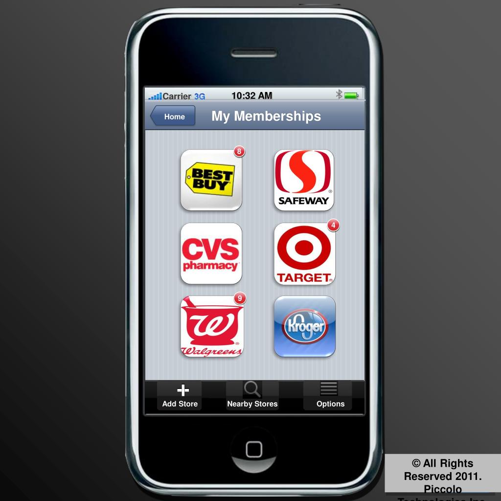 10:32 AM Carrier My Memberships App Home Screen This is where your app starts. Feel free to delete the instructions on the iPhone screen and start pasting UI elements from the MockApp library file. Have fun using MockApp! Home 8 4 9 Add Store Nearby Stores Options • © All Rights Reserved 2011. Piccolo Technologies Inc.