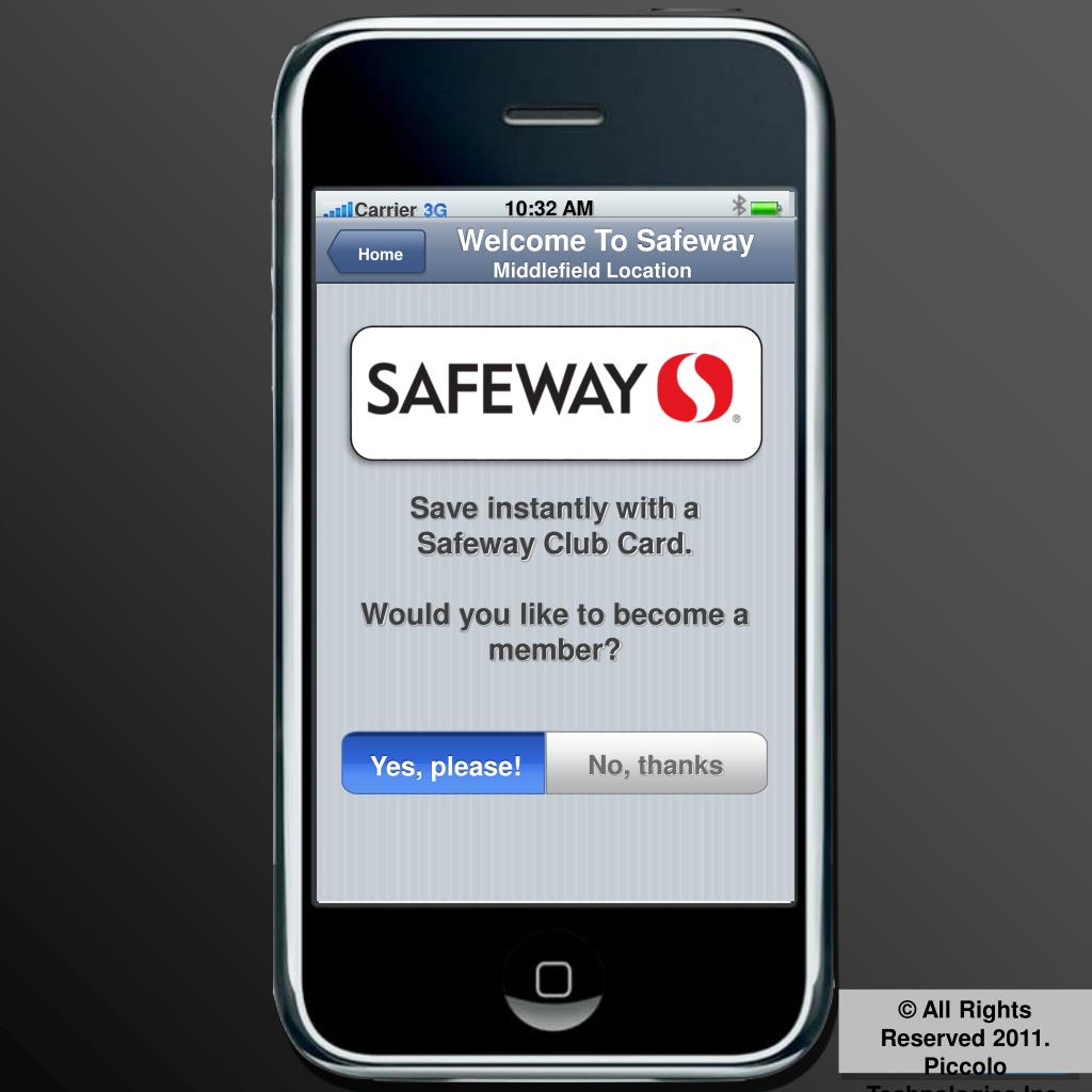 Welcome To Safeway Middlefield Location Welcome to Safeway! Middlefield Location 10:32 AM Carrier No, thanks Yes, please! App Home Screen This is where your app starts. Feel free to delete the instructions on the iPhone screen and start pasting UI elements from the MockApp library file. Have fun using MockApp! Home Save instantly with a Safeway Club Card. Would you like to become a member? • © All Rights Reserved 2011. Piccolo Technologies Inc.
