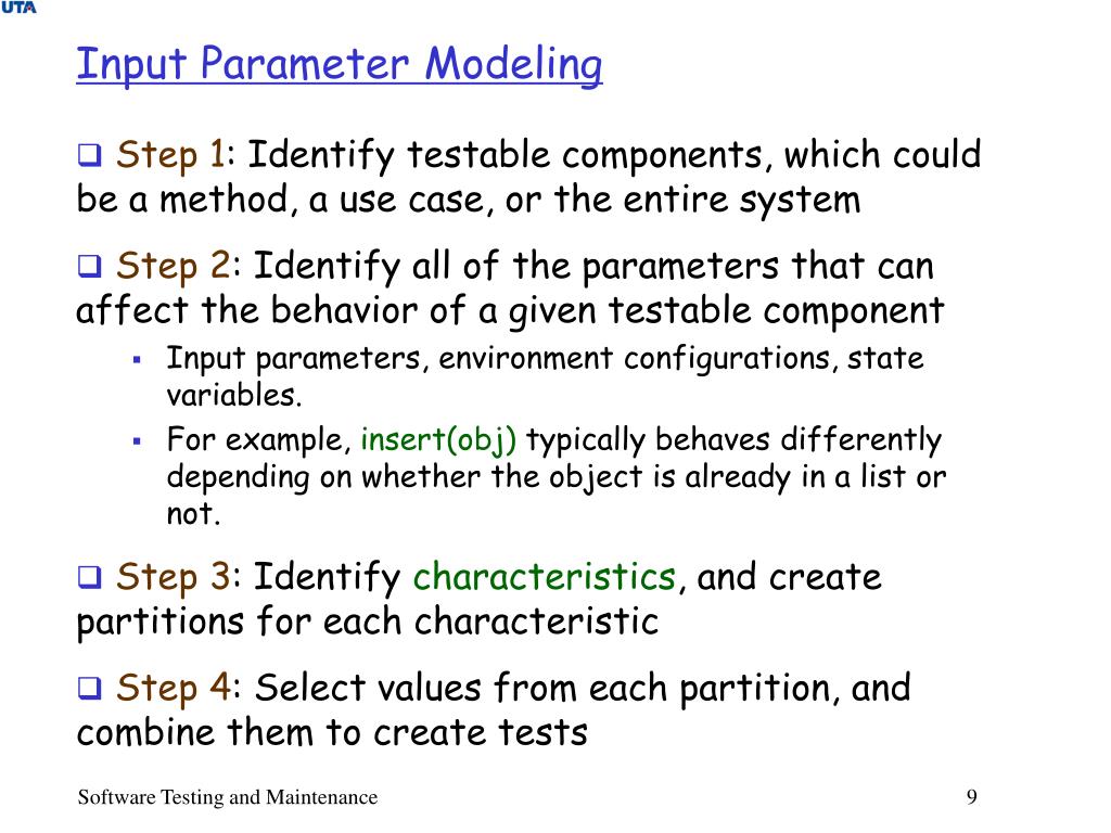 Input Parameter Modeling • Step 1: Identify testable components, which could be a method, a use case, or the entire system • Step 2: Identify all of the parameters that can affect the behavior of a given testable component • Input parameters, environment configurations, state variables. • For example, insert(obj) typically behaves differently depending on whether the object is already in a list or not. • Step 3: Identify characteristics, and create partitions for each characteristic • Step 4: Select values from each partition, and combine them to create tests Software Testing and Maintenance 9