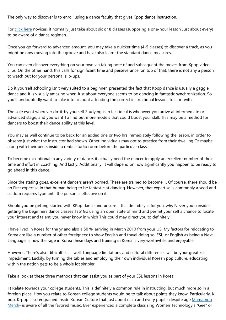 The only way to discover is to enroll using a dance faculty that gives Kpop dance instruction. For click here novices, it normally just take about six or 8 classes (supposing a one-hour lesson Just about every) to be aware of a dance regimen. Once you go forward to advanced amount, you may take a quicker time (4-5 classes) to discover a track, as you might be now moving into the groove and have also learnt the standard dance measures. You can even discover everything on your own via taking note of and subsequent the moves from Kpop video clips. On the other hand, this calls for significant time and perseverance, on top of that, there is not any a person to watch out for your personal slip-ups. Do it yourself schooling isn't very suited to a beginner, presented the fact that Kpop dance is usually a gaggle dance and it is visually amazing when Just about everyone seems to be dancing in fantastic synchronization. So, you'll undoubtedly want to take into account attending the correct instructional lessons to start with. The sole event wherever do-it-by yourself Studying is in fact ideal is whenever you arrive at intermediate or advanced stage, and you want To find out more models that could boost your skill. This may be a method for dancers to boost their dance ability at this level. You may as well continue to be back for an added one or two hrs immediately following the lesson, in order to observe just what the instructor had shown. Other individuals may opt to practice from their dwelling Or maybe along with their peers inside a rental studio room before the particular class. To become exceptional in any variety of dance, it actually need the dancer to apply an excellent number of their time and effort in coaching. And lastly, Additionally, it will depend on how significantly you happen to be ready to go ahead in this dance. Since the stating goes, excellent dancers aren't borned, These are trained to become 1. Of course, there should be an First expertise in that human being to be fantastic at dancing. However, that expertise is commonly a seed and seldom requires type until the person is effective on it. Should you be getting started with KPop dance and unsure if this definitely is for you, why Never you consider getting the beginners dance classes 1st? Go using an open state of mind and permit your self a chance to locate your interest and talent, you never know in which This could may direct you to definitely! I have lived in Korea for the yr and also a 50 %, arriving in March 2010 from your US. My factors for relocating to Korea are like a number of other foreigners: to show English and travel doing so. ESL, or English as being a Next Language, is now the rage in Korea these days and training in Korea is very worthwhile and enjoyable. However, There's also difficulties as well. Language limitations and cultural differences will be your greatest impediment. Luckily, by turning the tables and employing their own individual Korean pop culture, educating within the nation gets to be a whole lot simpler. Take a look at these three methods that can assist you as part of your ESL lessons in Korea: 1) Relate towards your college students. This is definitely a common rule in instructing, but much more so in a foreign place. How you relate to Korean college students would be to talk about points they know. Particularly, K- pop. K-pop is so engrained inside Korean Culture that just about each and every pupil - despite age Mamamoo Merch- is aware of all the favored music. Ever experienced a complete class sing Women Technology's "Gee" or