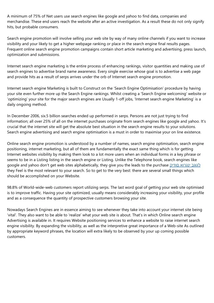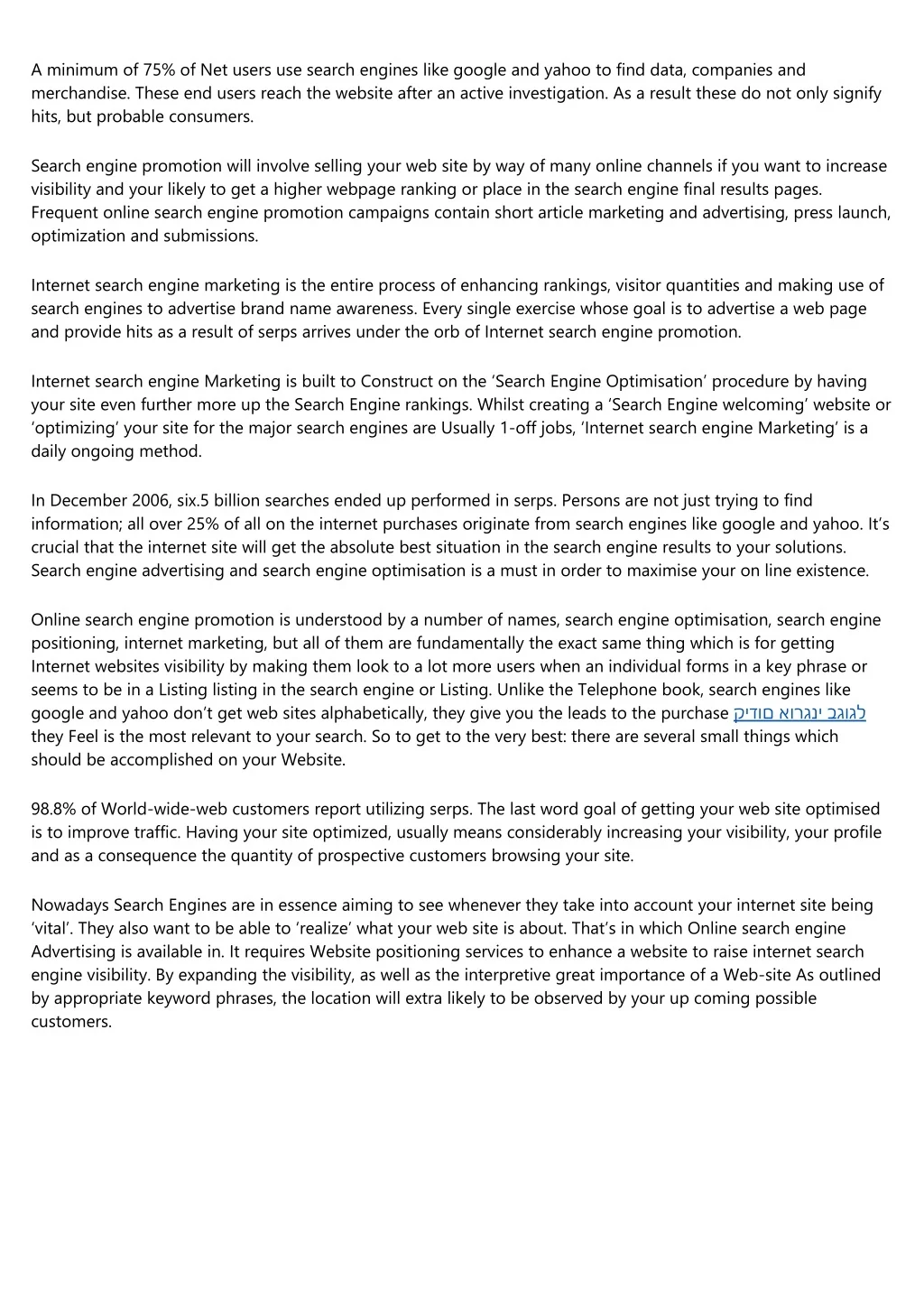 A minimum of 75% of Net users use search engines like google and yahoo to find data, companies and merchandise. These end users reach the website after an active investigation. As a result these do not only signify hits, but probable consumers. Search engine promotion will involve selling your web site by way of many online channels if you want to increase visibility and your likely to get a higher webpage ranking or place in the search engine final results pages. Frequent online search engine promotion campaigns contain short article marketing and advertising, press launch, optimization and submissions. Internet search engine marketing is the entire process of enhancing rankings, visitor quantities and making use of search engines to advertise brand name awareness. Every single exercise whose goal is to advertise a web page and provide hits as a result of serps arrives under the orb of Internet search engine promotion. Internet search engine Marketing is built to Construct on the ‘Search Engine Optimisation’ procedure by having your site even further more up the Search Engine rankings. Whilst creating a ‘Search Engine welcoming’ website or ‘optimizing’ your site for the major search engines are Usually 1-off jobs, ‘Internet search engine Marketing’ is a daily ongoing method. In December 2006, six.5 billion searches ended up performed in serps. Persons are not just trying to find information; all over 25% of all on the internet purchases originate from search engines like google and yahoo. It’s crucial that the internet site will get the absolute best situation in the search engine results to your solutions. Search engine advertising and search engine optimisation is a must in order to maximise your on line existence. Online search engine promotion is understood by a number of names, search engine optimisation, search engine positioning, internet marketing, but all of them are fundamentally the exact same thing which is for getting Internet websites visibility by making them look to a lot more users when an individual forms in a key phrase or seems to be in a Listing listing in the search engine or Listing. Unlike the Telephone book, search engines like google and yahoo don’t get web sites alphabetically, they give you the leads to the purchase קידום אורגני בגוגל they Feel is the most relevant to your search. So to get to the very best: there are several small things which should be accomplished on your Website. 98.8% of World-wide-web customers report utilizing serps. The last word goal of getting your web site optimised is to improve traffic. Having your site optimized, usually means considerably increasing your visibility, your profile and as a consequence the quantity of prospective customers browsing your site. Nowadays Search Engines are in essence aiming to see whenever they take into account your internet site being ‘vital’. They also want to be able to ‘realize’ what your web site is about. That’s in which Online search engine Advertising is available in. It requires Website positioning services to enhance a website to raise internet search engine visibility. By expanding the visibility, as well as the interpretive great importance of a Web-site As outlined by appropriate keyword phrases, the location will extra likely to be observed by your up coming possible customers.