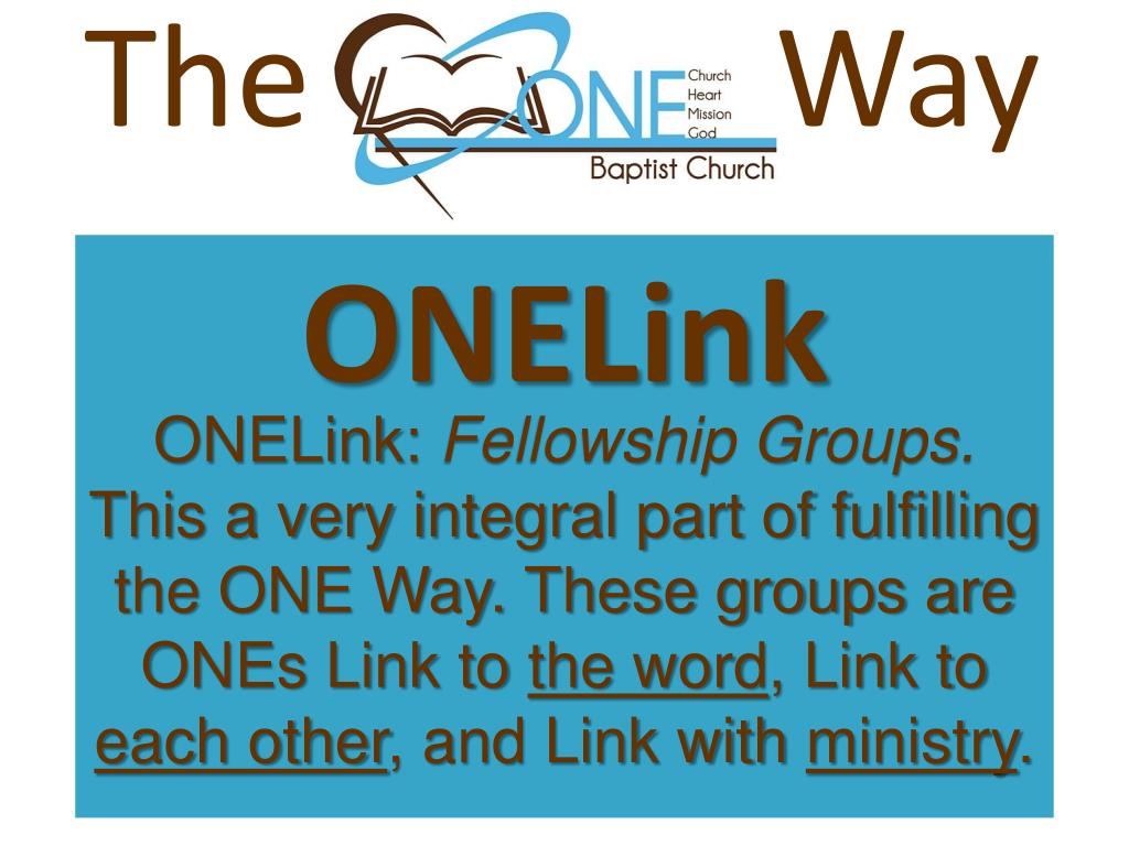 Way ONELink The ONELink: Fellowship Groups.This a very integral part of fulfilling the ONE Way. These groups are ONEs Link to the word, Link to each other, and Link with ministry.
