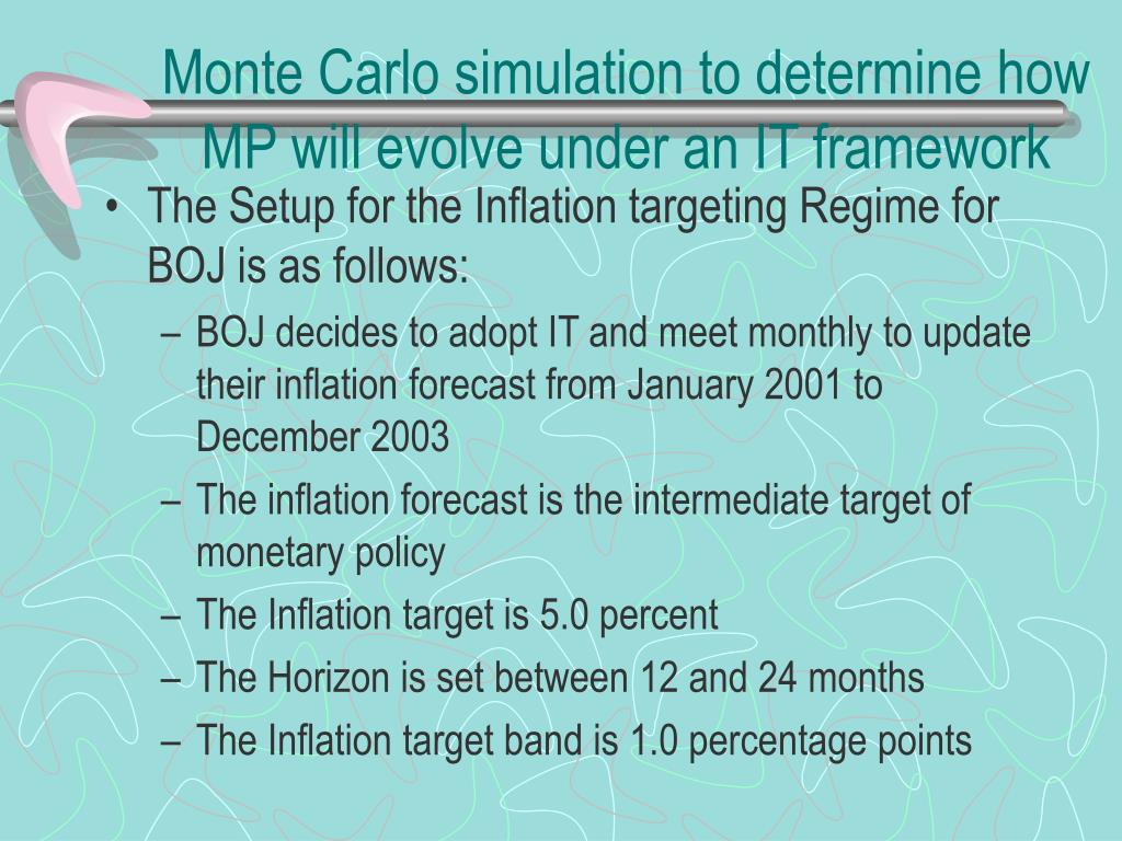 Monte Carlo simulation to determine how MP will evolve under an IT framework • The Setup for the Inflation targeting Regime for BOJ is as follows: • BOJ decides to adopt IT and meet monthly to update their inflation forecast from January 2001 to December 2003 • The inflation forecast is the intermediate target of monetary policy • The Inflation target is 5.0 percent • The Horizon is set between 12 and 24 months • The Inflation target band is 1.0 percentage points