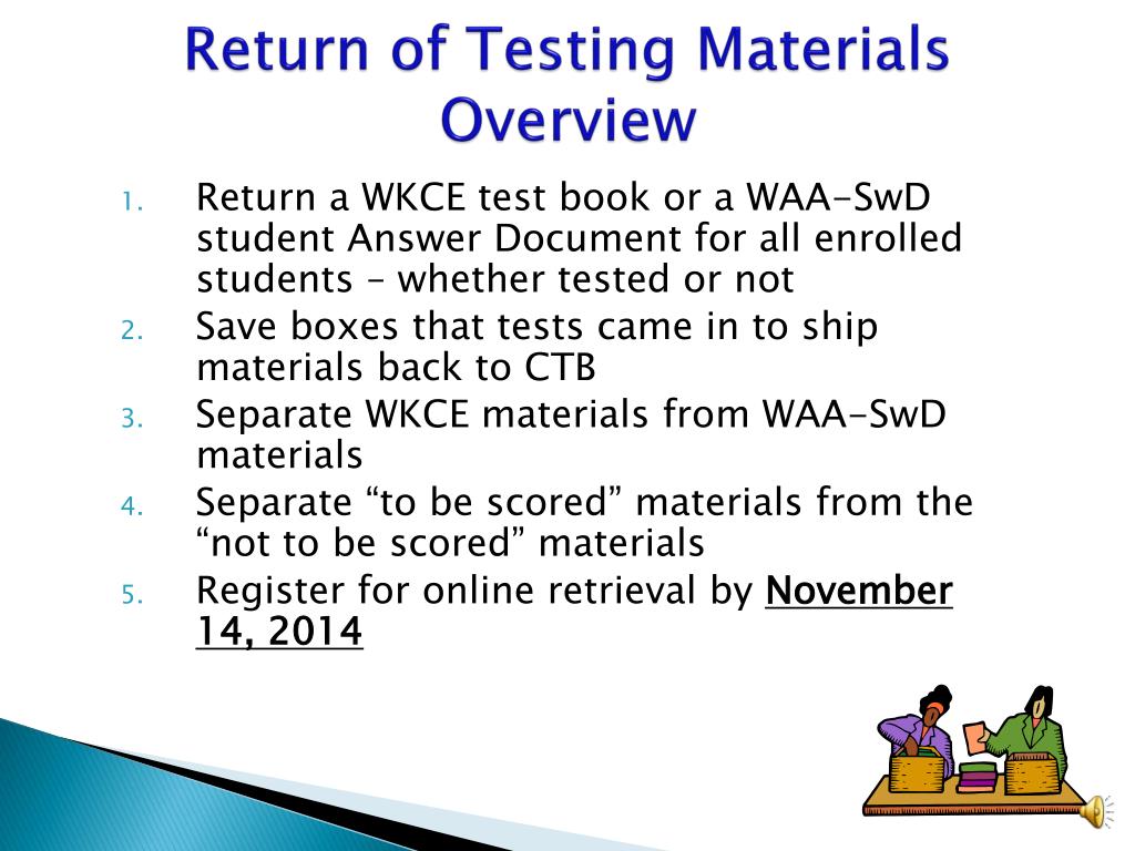 Return of Testing Materials Overview • Return a WKCE test book or a WAA-SwD student Answer Document for all enrolled students – whether tested or not • Save boxes that tests came in to ship materials back to CTB • Separate WKCE materials from WAA-SwD materials • Separate “to be scored” materials from the “not to be scored” materials • Register for online retrieval by November 14, 2014
