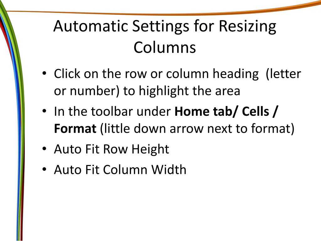 Automatic Settings for Resizing Columns • Click on the row or column heading (letter or number) to highlight the area • In the toolbar under Home tab/ Cells / Format (little down arrow next to format) • Auto Fit Row Height • Auto Fit Column Width