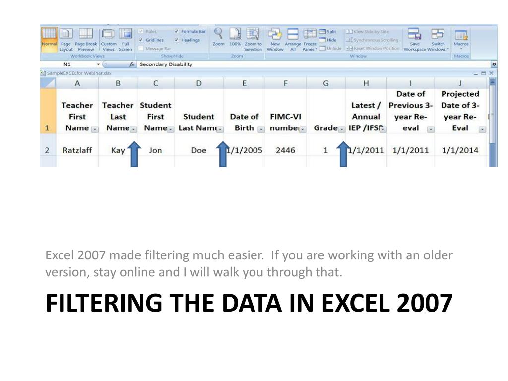 Terms and Definitions • Sort – rearranging the information/ data in a new format. You can sort alphabetically A to Z or Z to A, numerically, or date range. Example sorting the IEP dates from oldest to newest • Filter – not showing some of the information in the spreadsheet. For example the supervisor can filter on the TVIs name and only see those students. Or, filter on the blanks for FVA and see how many FVAs are missing.