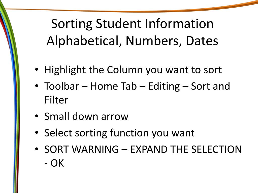 Sorting Student Information Alphabetical, Numbers, Dates • Highlight the Column you want to sort • Toolbar – Home Tab – Editing – Sort and Filter • Small down arrow • Select sorting function you want • SORT WARNING – EXPAND THE SELECTION - OK