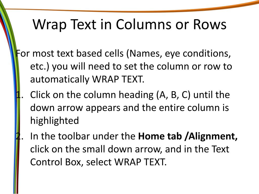 Wrap Text in Columns or Rows For most text based cells (Names, eye conditions, etc.) you will need to set the column or row to automatically WRAP TEXT. • Click on the column heading (A, B, C) until the down arrow appears and the entire column is highlighted • In the toolbar under the Home tab /Alignment, click on the small down arrow, and in the Text Control Box, select WRAP TEXT.