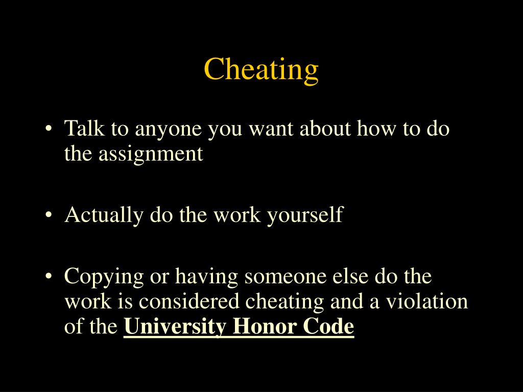 Cheating • Talk to anyone you want about how to do the assignment • Actually do the work yourself • Copying or having someone else do the work is considered cheating and a violation of the University Honor Code