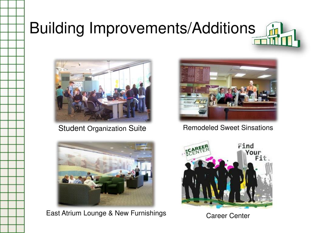 Building Improvements/Additions Student Organization Suite Remodeled Sweet Sinsations East Atrium Lounge & New Furnishings Career Center