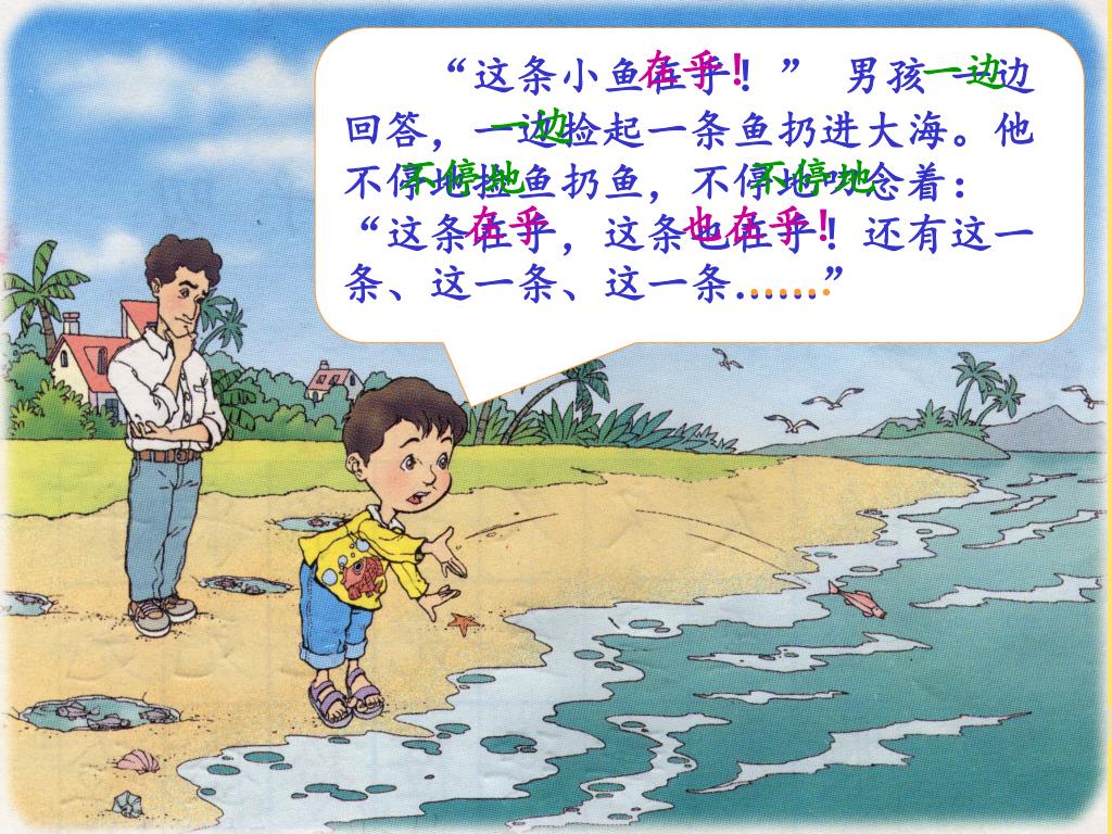 在乎! 不停地 一边 不停地 一边 在乎 也在乎! “这条小鱼在乎!” 男孩 一边回答,一边捡起一条鱼扔进大海。他不停地捡鱼扔鱼,不停地叨念着:“这条在乎,这条也在乎!还有这一条、这一条、这一条……” ……