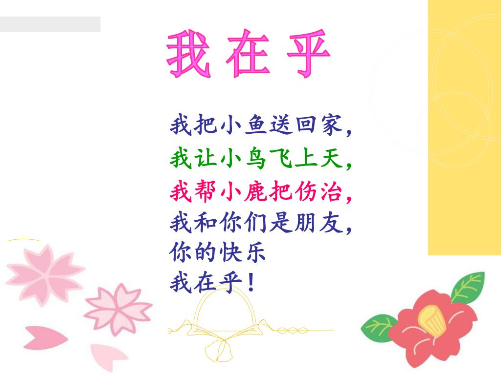 我 在 乎 我把小鱼送回家, 我让小鸟飞上天, 我帮小鹿把伤治, 我和你们是朋友, 你的快乐 我在乎!