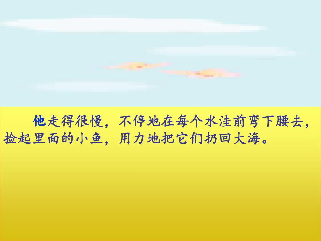 他走得很慢,不停地在每个水洼前弯下腰去,捡起里面的小鱼,用力地把它们扔回大海。他走得很慢,不停地在每个水洼前弯下腰去,捡起里面的小鱼,用力地把它们扔回大海。 他