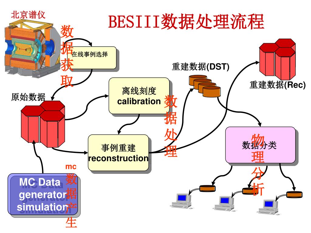 北京谱仪 BESIII数据处理流程 数据获取 在线事例选择 重建数据(DST) 离线刻度 calibration 重建数据(Rec) 原始数据 数据处理 数据分类 物理分析 事例重建 reconstruction mc数据产生 MC Data generator simulation