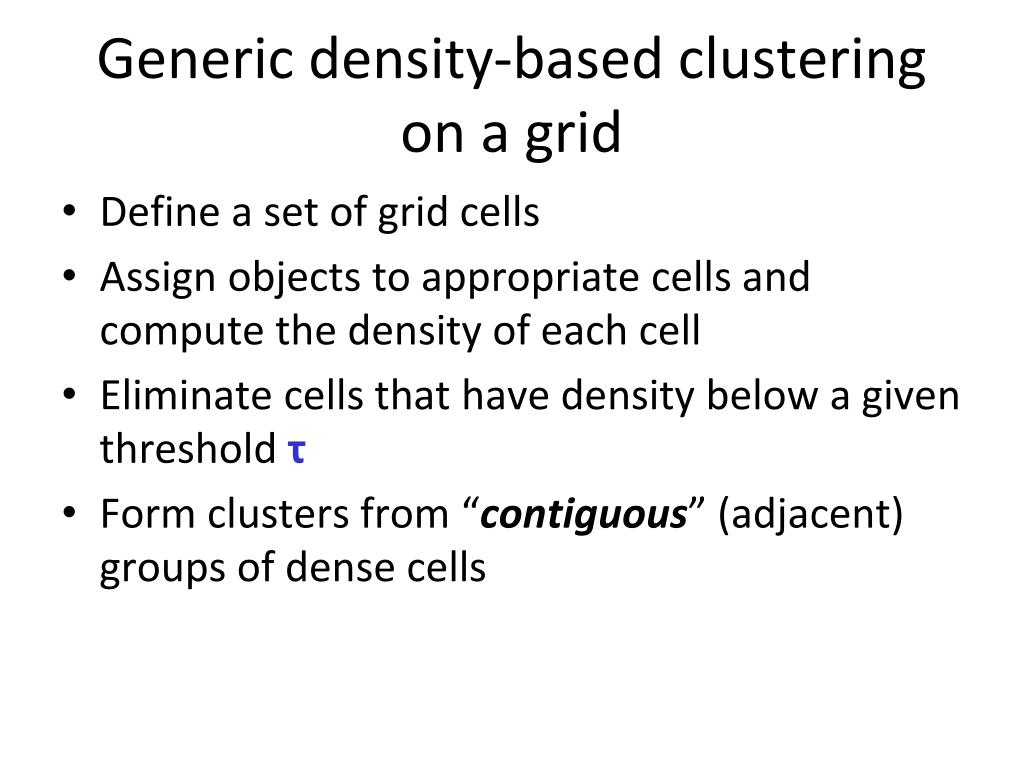 Generic density-based clustering on a grid • Define a set of grid cells • Assign objects to appropriate cells and compute the density of each cell • Eliminate cells that have density below a given threshold τ • Form clusters from “contiguous” (adjacent) groups of dense cells