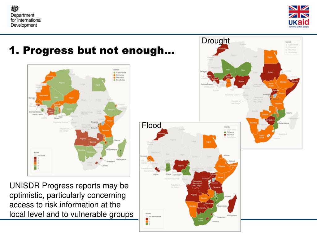 Drought 1. Progress but not enough… Flood UNISDR Progress reports may be optimistic, particularly concerning access to risk information at the local level and to vulnerable groups