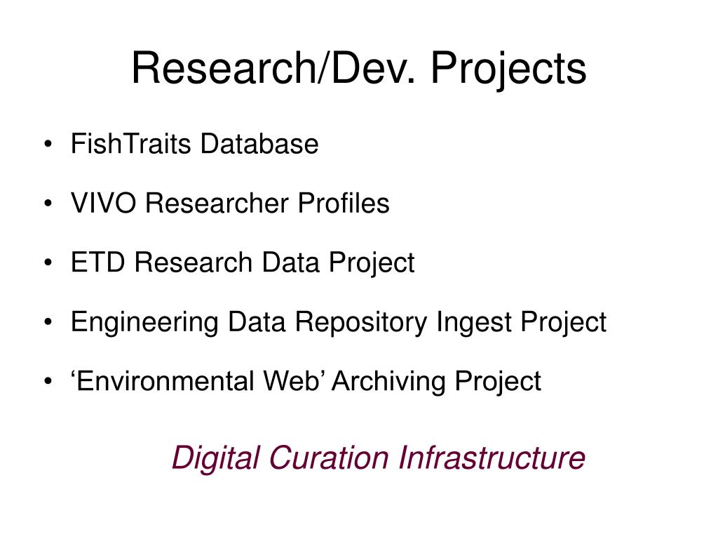 Research/Dev. Projects • FishTraits Database • VIVO Researcher Profiles • ETD Research Data Project • Engineering Data Repository Ingest Project • ‘Environmental Web’ Archiving Project Digital Curation Infrastructure