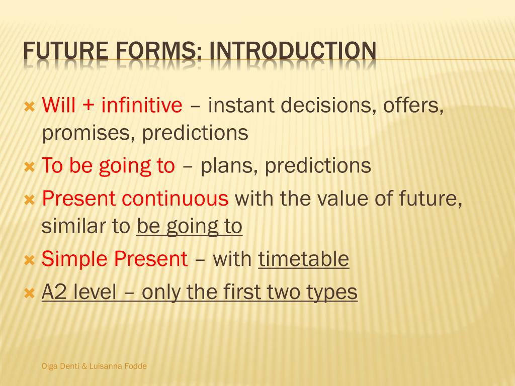 Will + infinitive – instant decisions, offers, promises, predictions To be going to – plans, predictions Present continuous with the value of future, similar to be going to Simple Present – with timetable A2 level – only the first two types Future forms: introduction